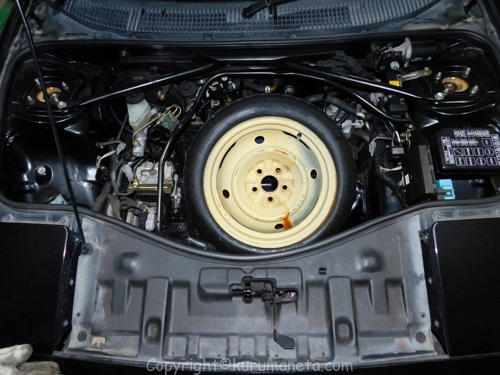 SW20型MR2のバッテリーはフロントフードを開けてスペアタイヤを外すと、その裏にあります。