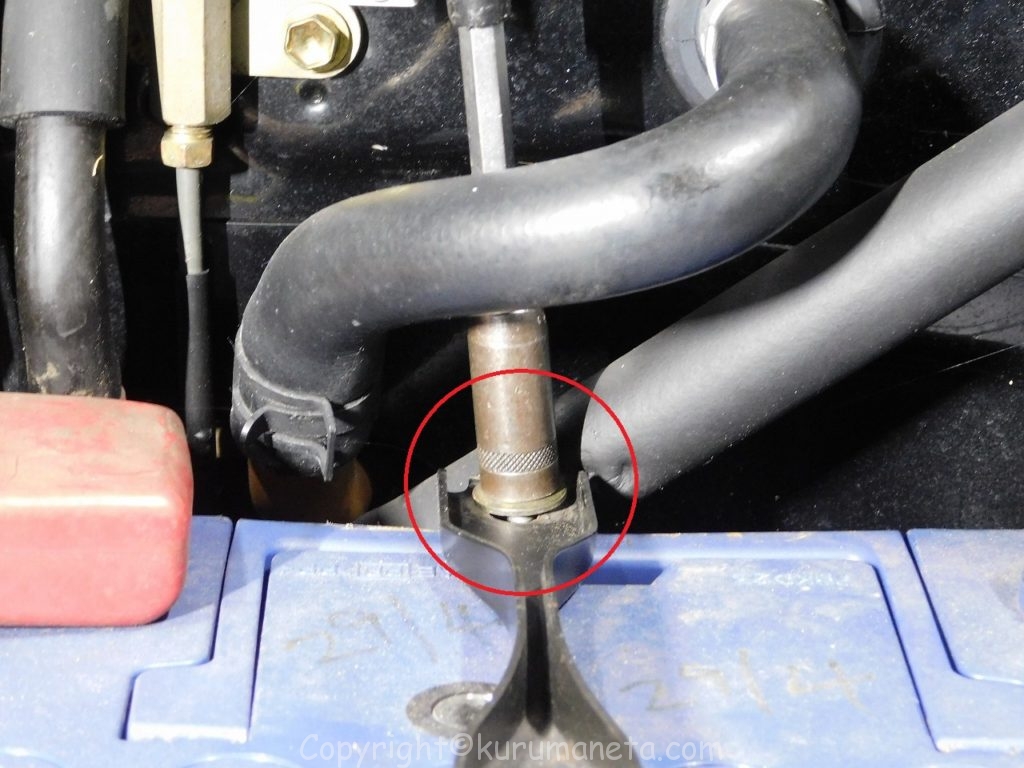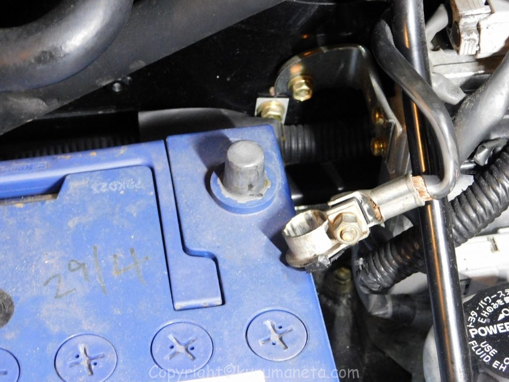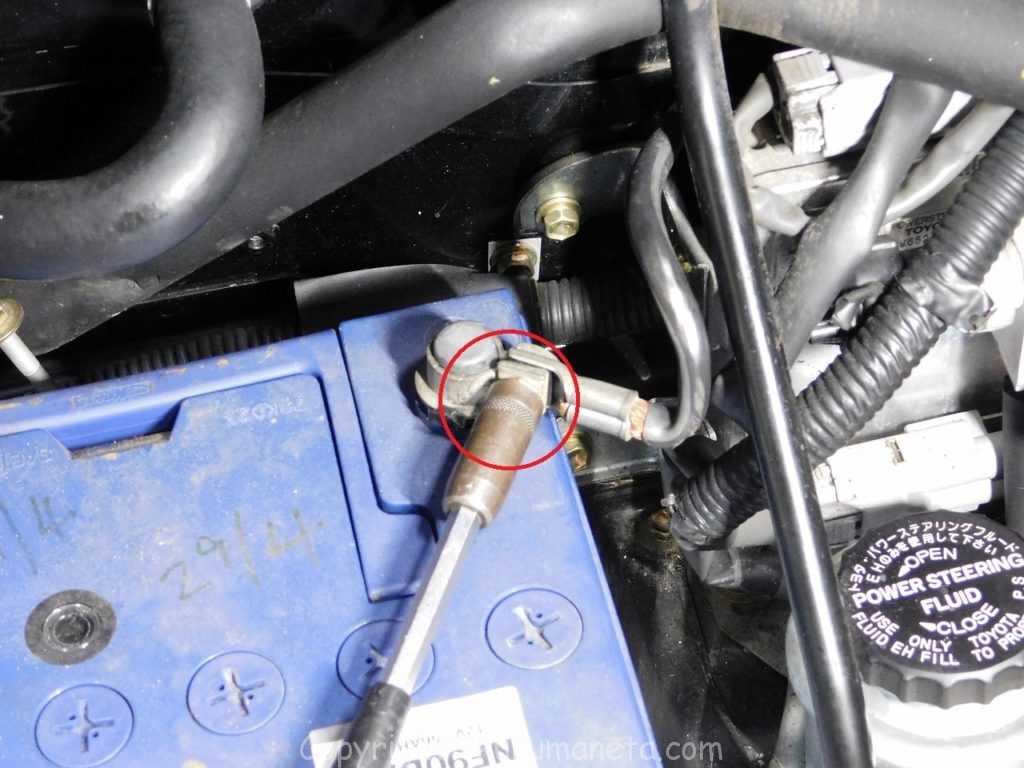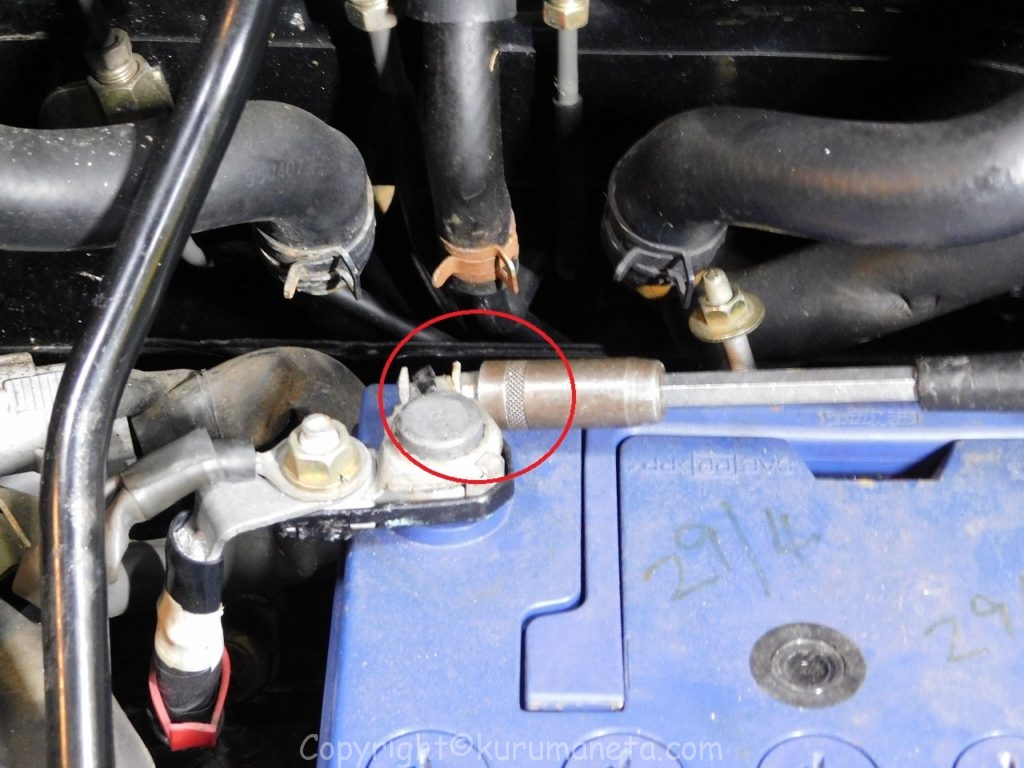 マイナス端子を外してからプラス端子を外すようにします。