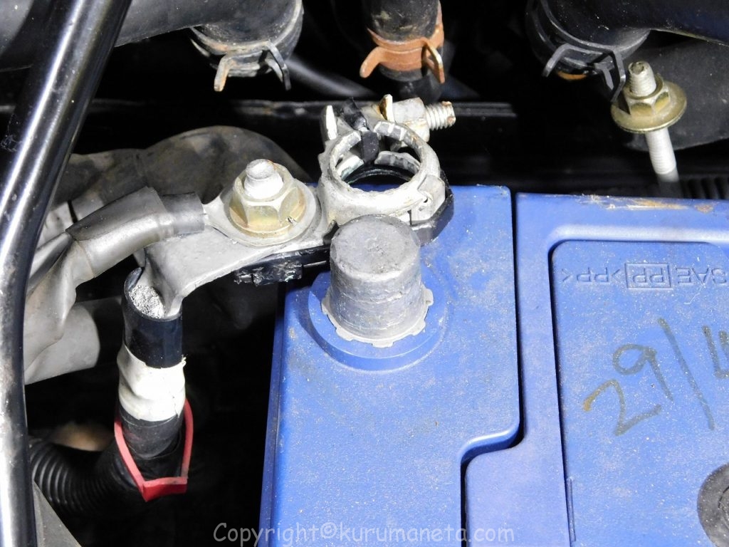 バッテリーの端子を外す時はマイナス端子⇒プラス端子の順番で外していきます。