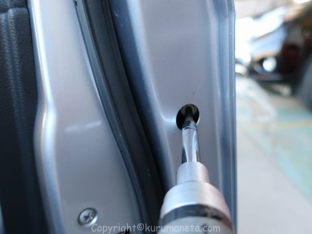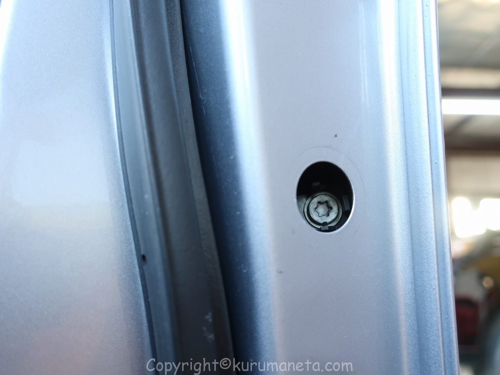 ドアを開けるとちょうどドアキーシリンダーの横の位置あたりに写真のような目くら蓋があるので、こちらを外します。