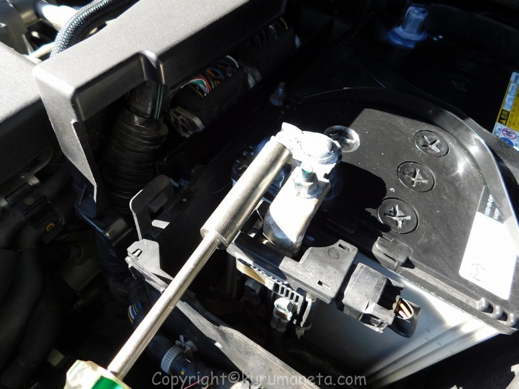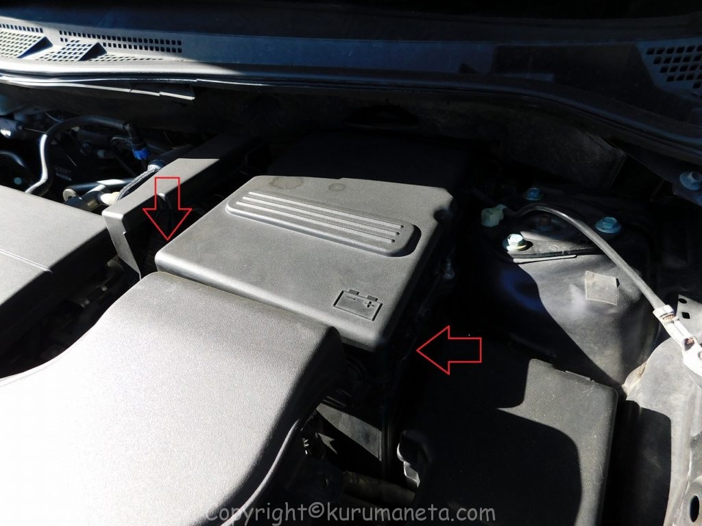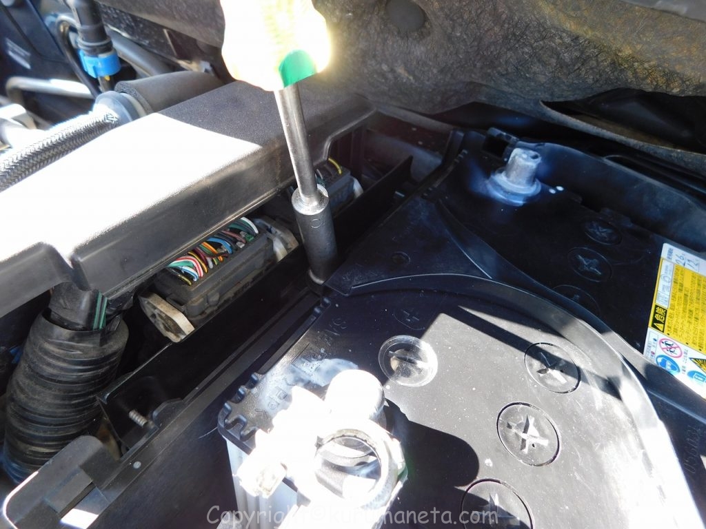 カバーは爪で固定されているだけなので、簡単に外れますが、エンジンルームの奥で、狭いのでやりづらいです。