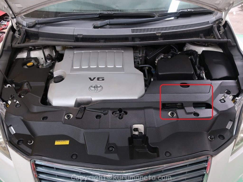作業したのはGGA10型のマークXジオですが、ジオであればエンジンルームの配置もほぼ同じで、作業内容もほぼ共通なのでご参照ください。