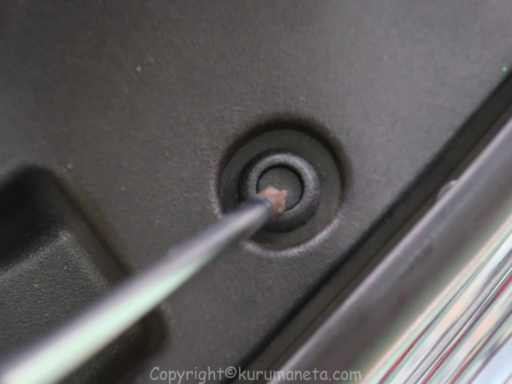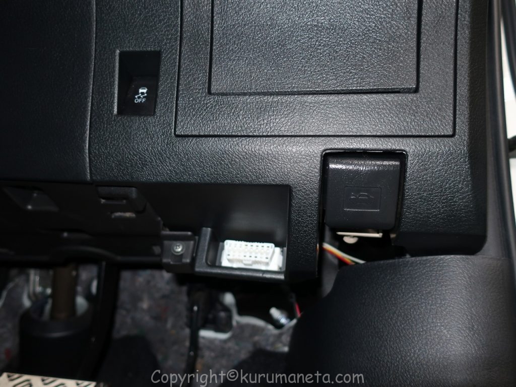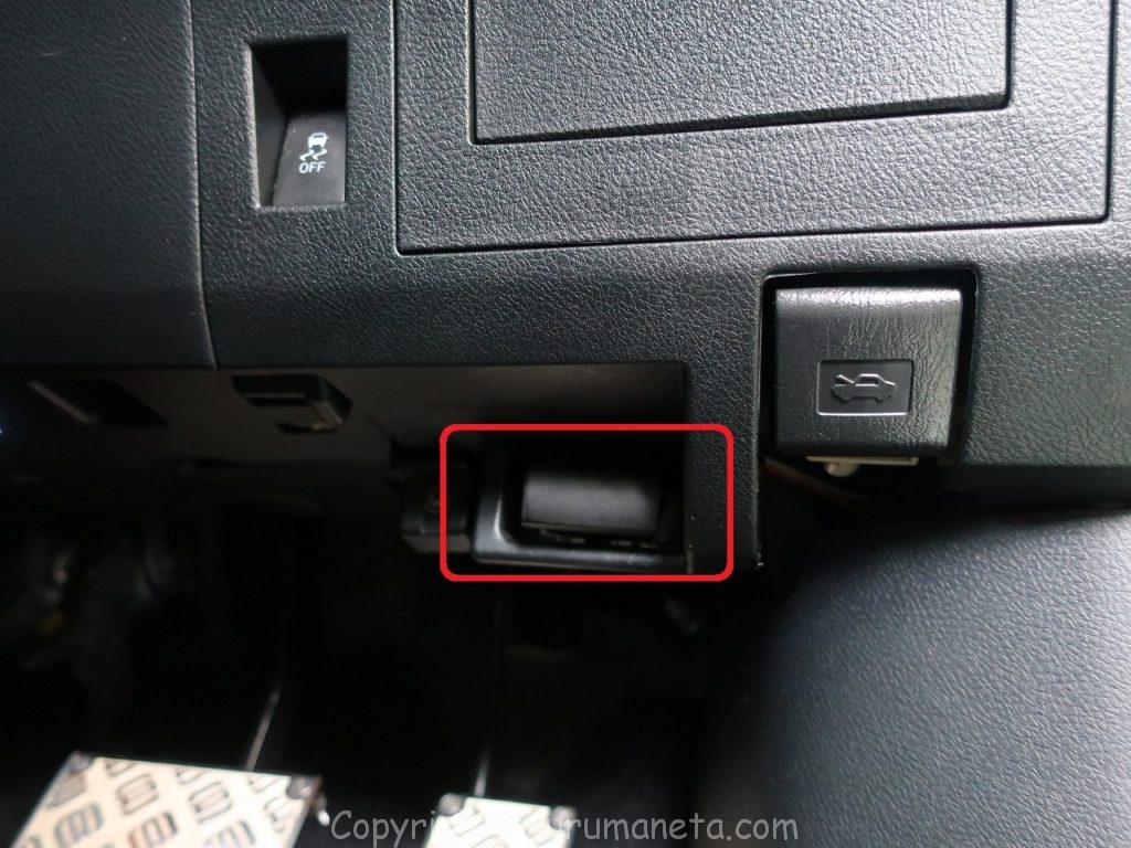 マークXジオのOBD2端子はボンネットオープナーの左奥側にあります。