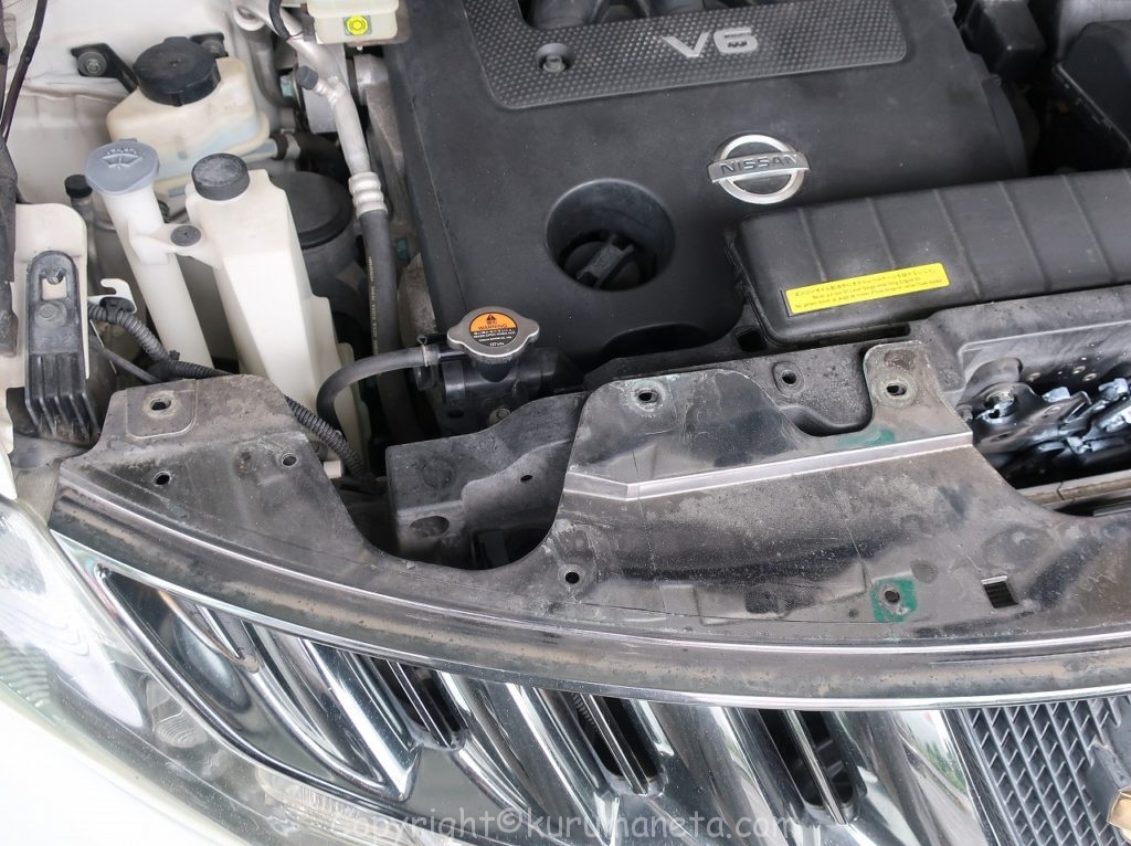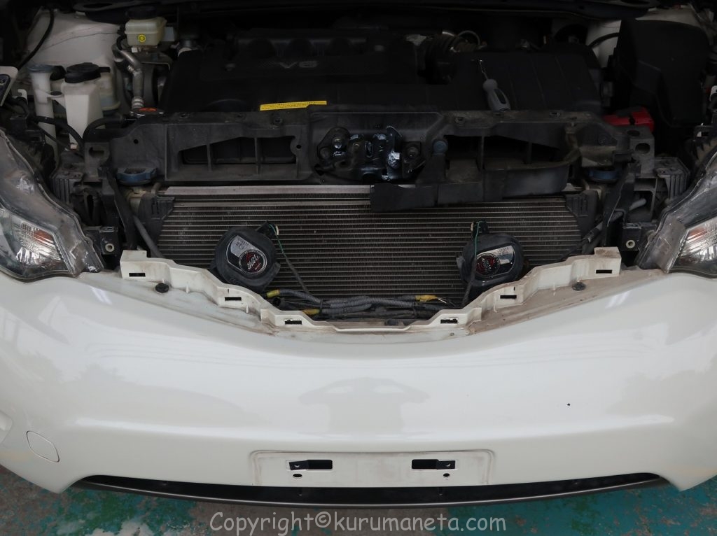 ボンネットを開けて、グリル上部の黒の樹脂カバーを外します。
