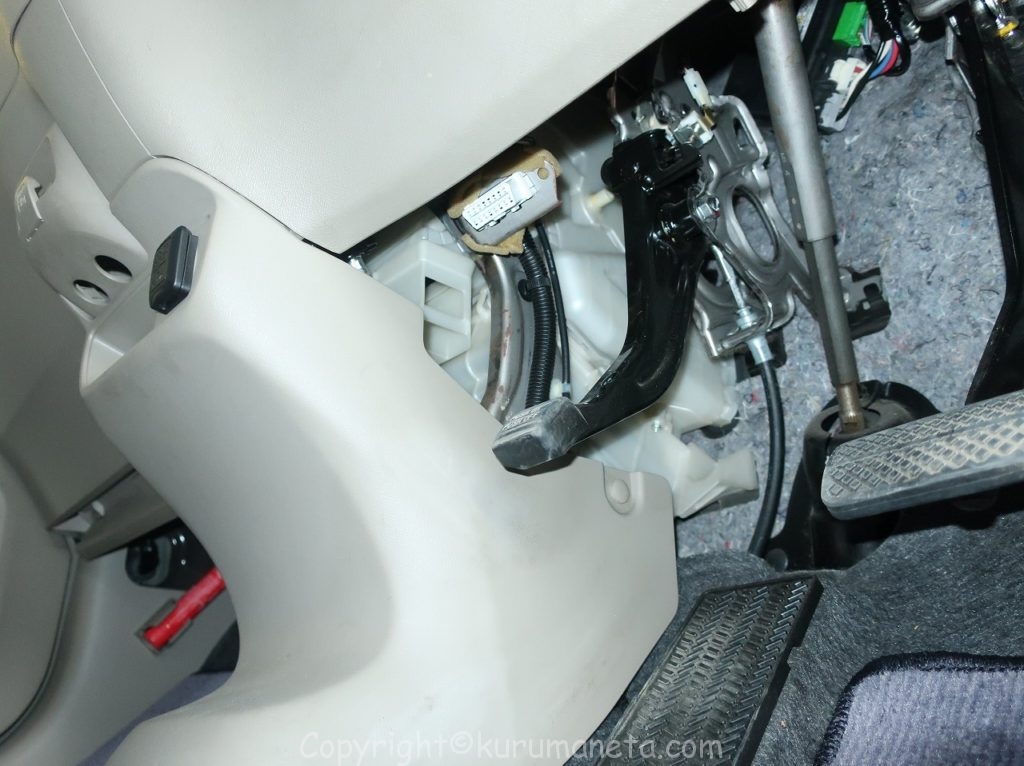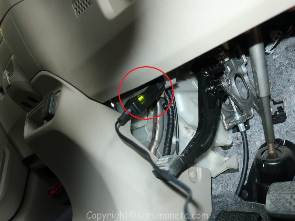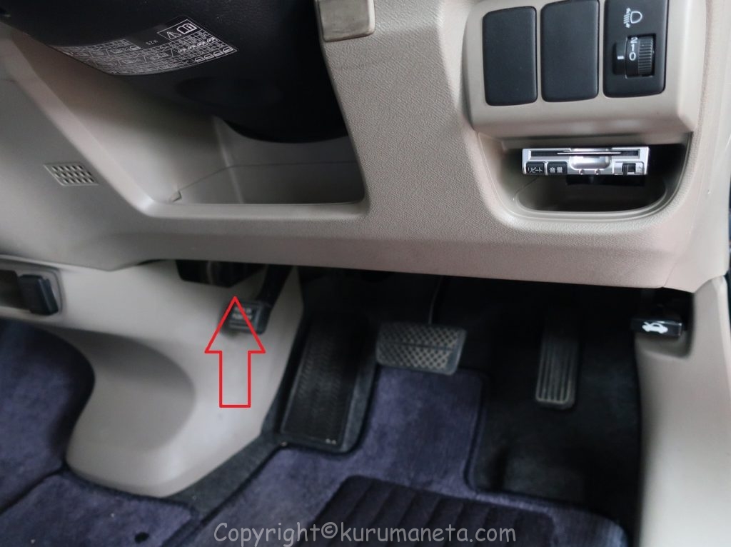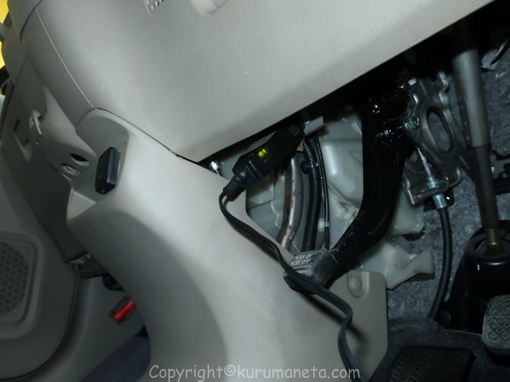 JC1ライフのOBD2カプラーは運転席足元の写真の位置にあります。