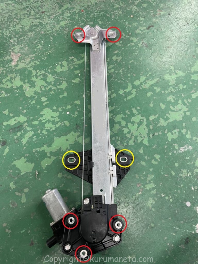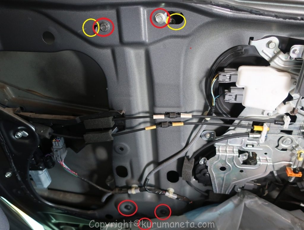 黄色丸はドアパネル内部でガラスとレギュレーターを固定してるボルトです。
