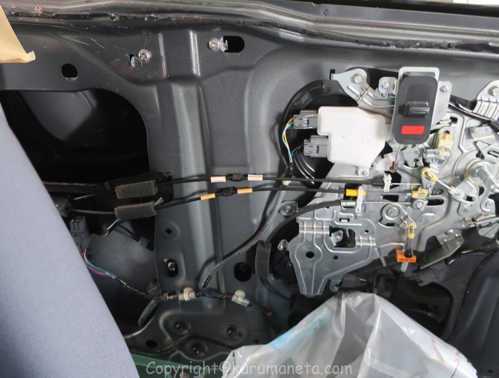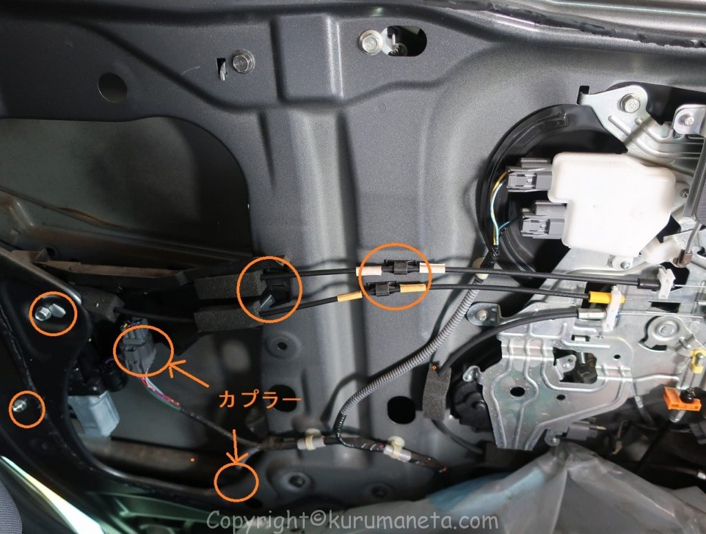 尚、ドアロックアクチュエーターに付随する部品が動くようになるとレギュレーターが外しやすくなるので以下のネジ、クリップ、カプラーを外して余裕が出るようにします。
