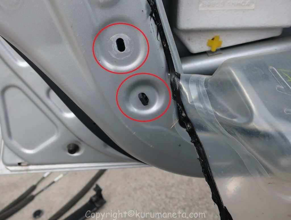 ネジを外した際にドアパネル内部に落下させると取り出すのが困難になる可能性があるので注意します。