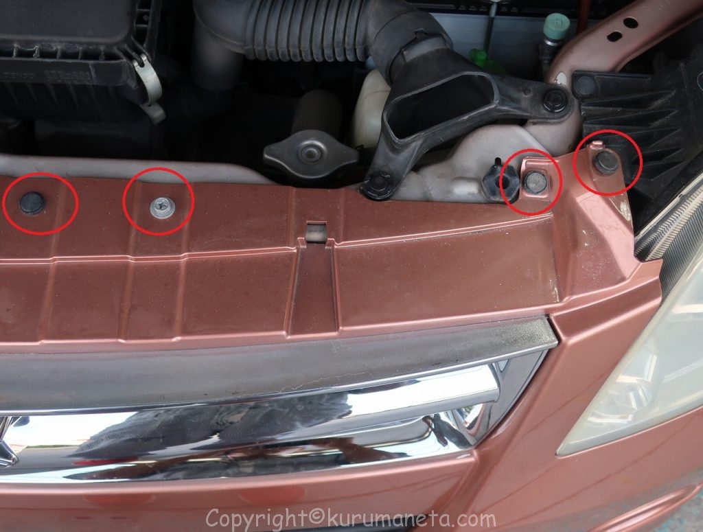 ボンネットを開けてバンパー上部のボルトとクリップを外します。(クリップ5個、ボルト2本)