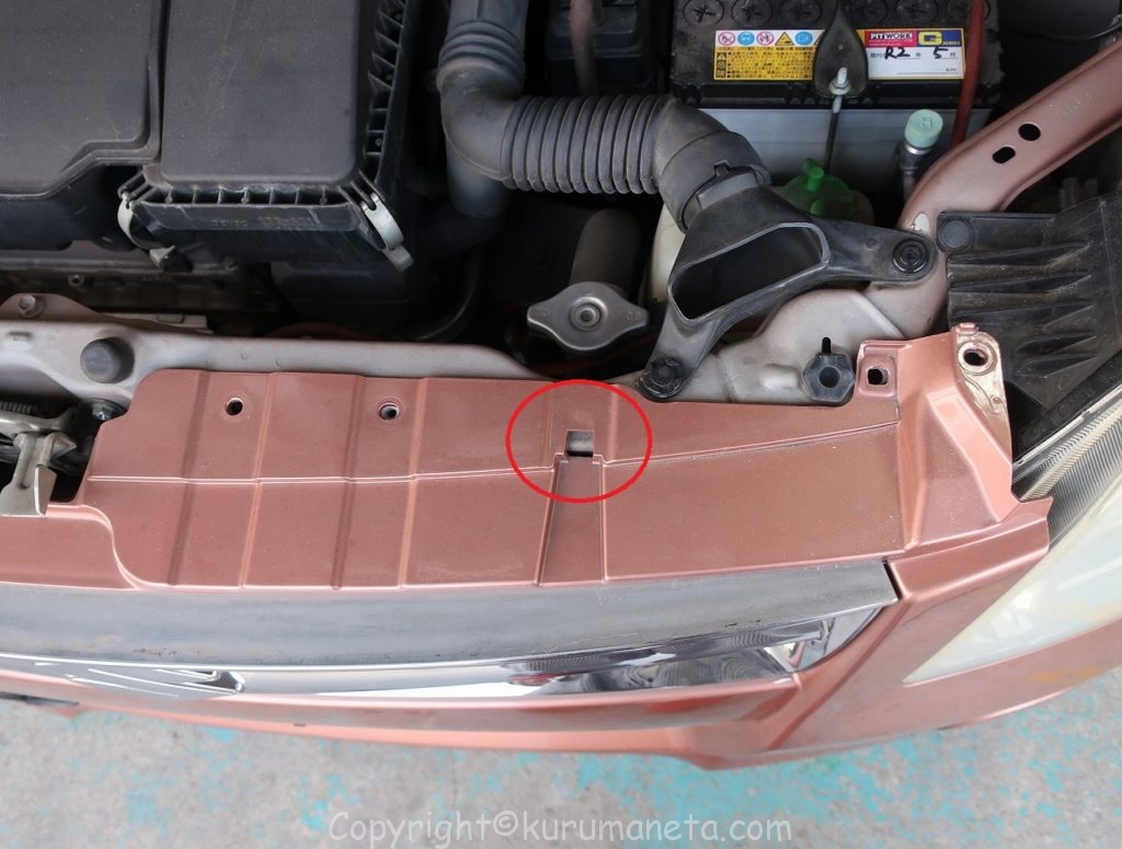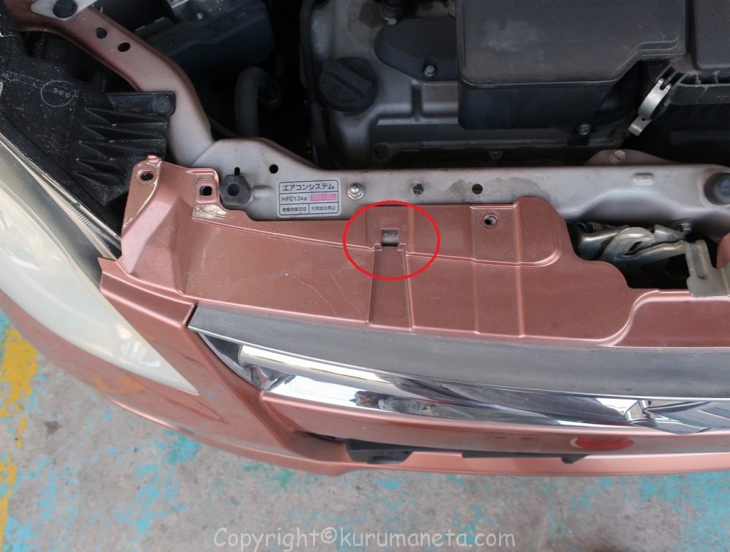 左右のフェンダーとの継ぎ目付近にあるクリップを外します。