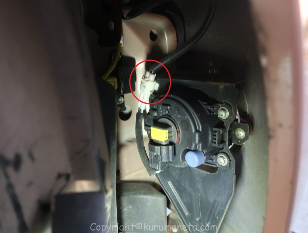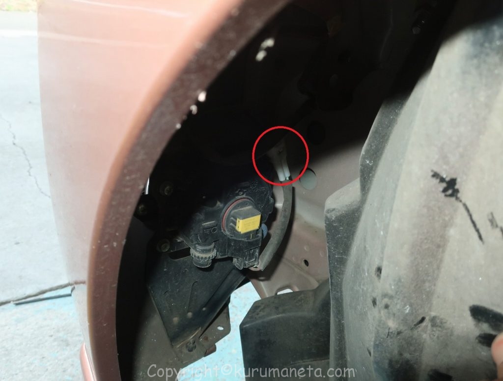 フェンダーライナーを手で広げるとフォグランプが見えるので、白いカプラーを外します。