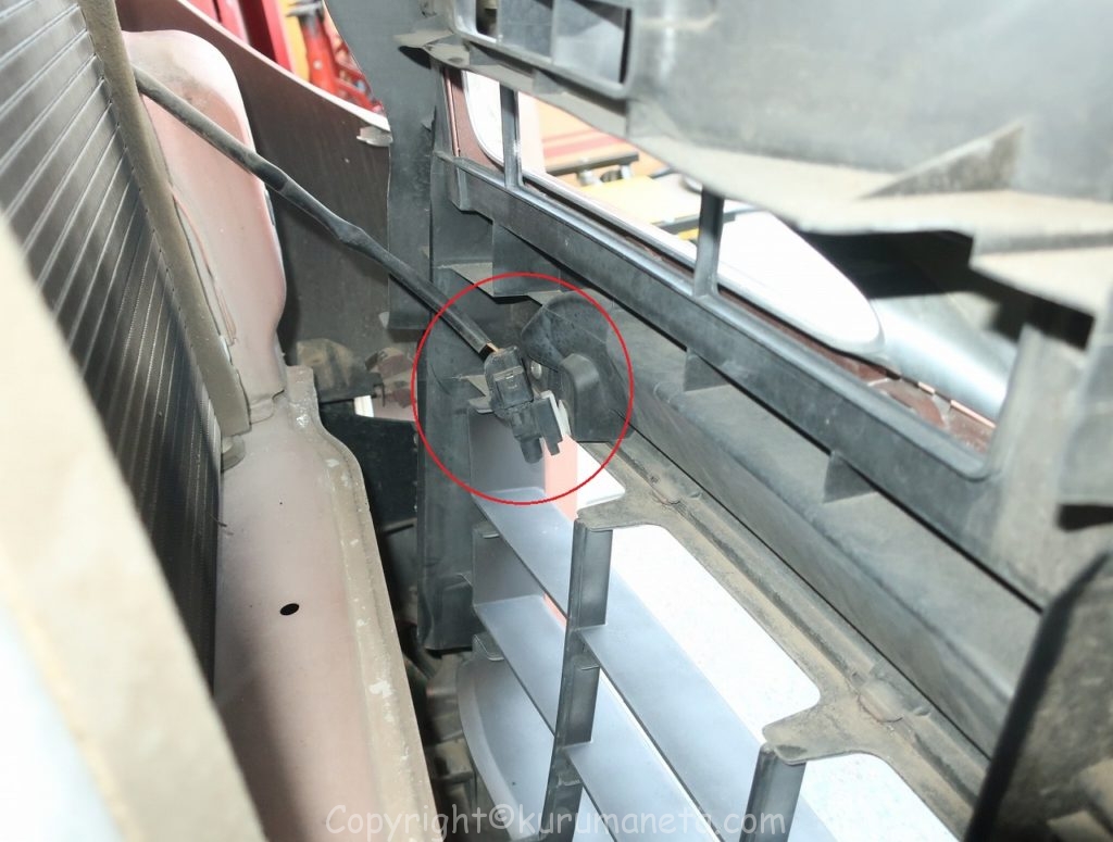 これでバンパーが外れますが、少し前に出すとグリル後部に外気温センサーがあるのが見えますのでこのクリップを外してバンパー取り外しが完了となります。