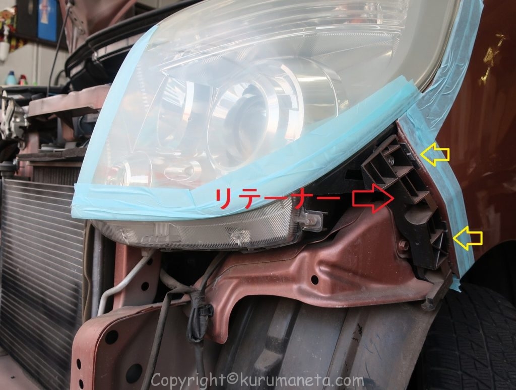 下の写真はバンパーが外れた状態のものですが、黒いのがリテーナーで、黄色の向きでバンパーがはまっています。