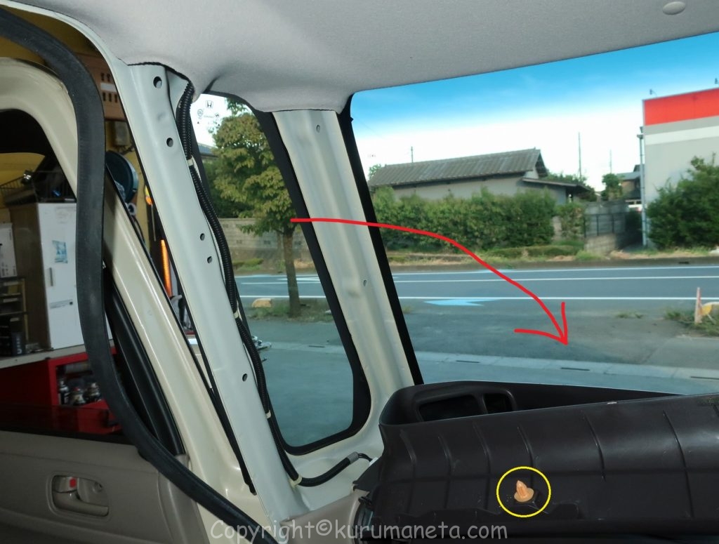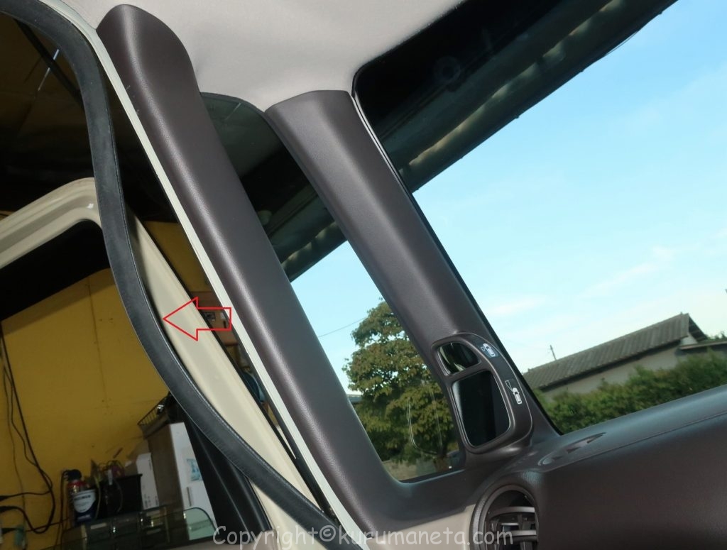 左のフロントピラートリムを外します。(写真のグレーの2本の柱です)
