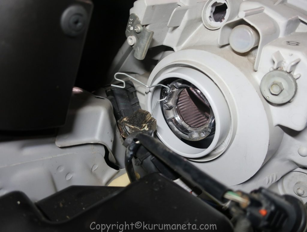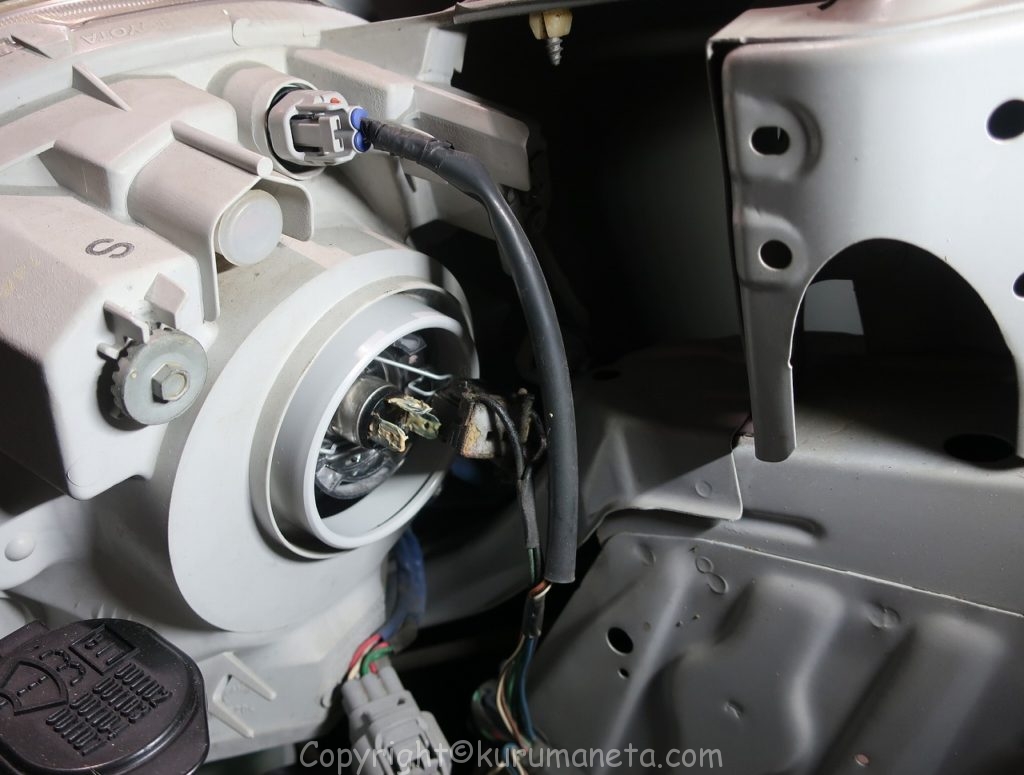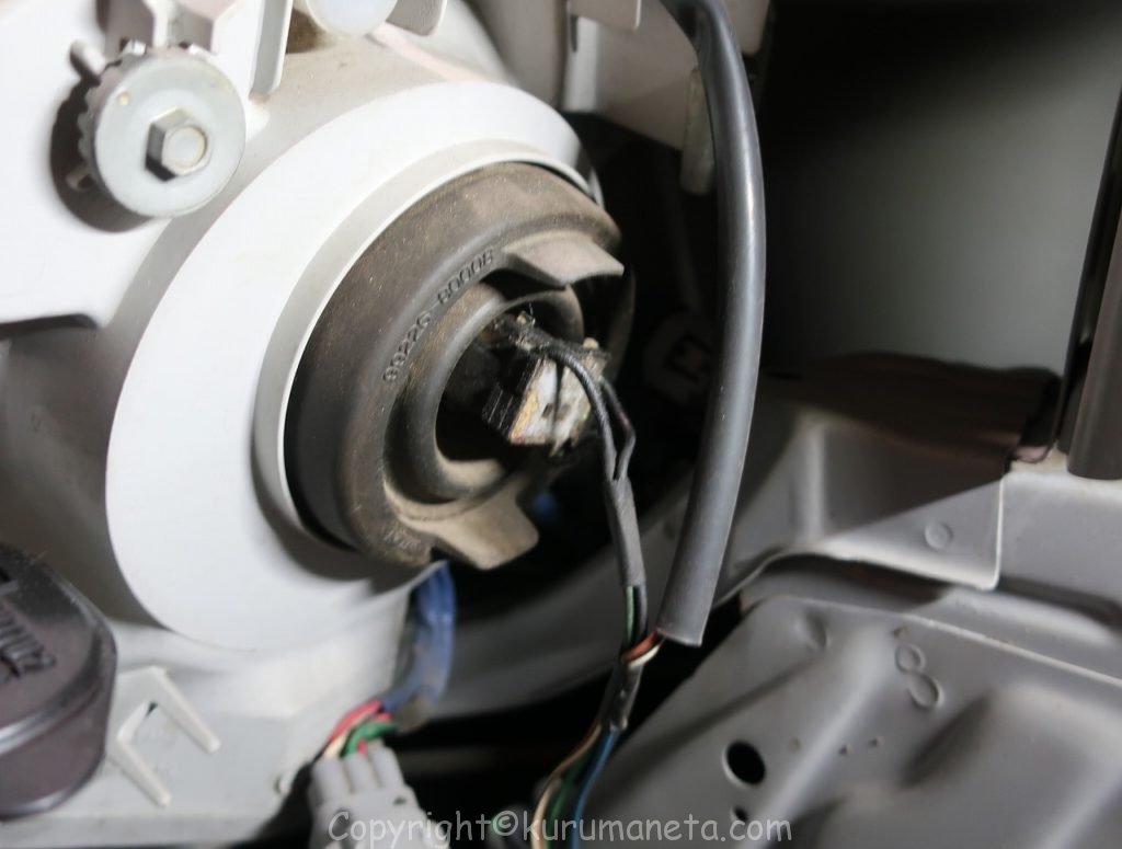 ヘッドライトの裏側をのぞき込むと黒いゴムカバーとヘッドライトのカプラーがあるので、先に黒いカプラーを外します。