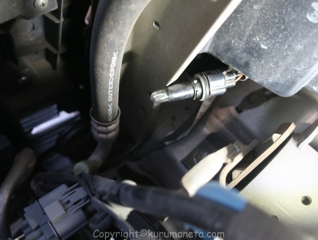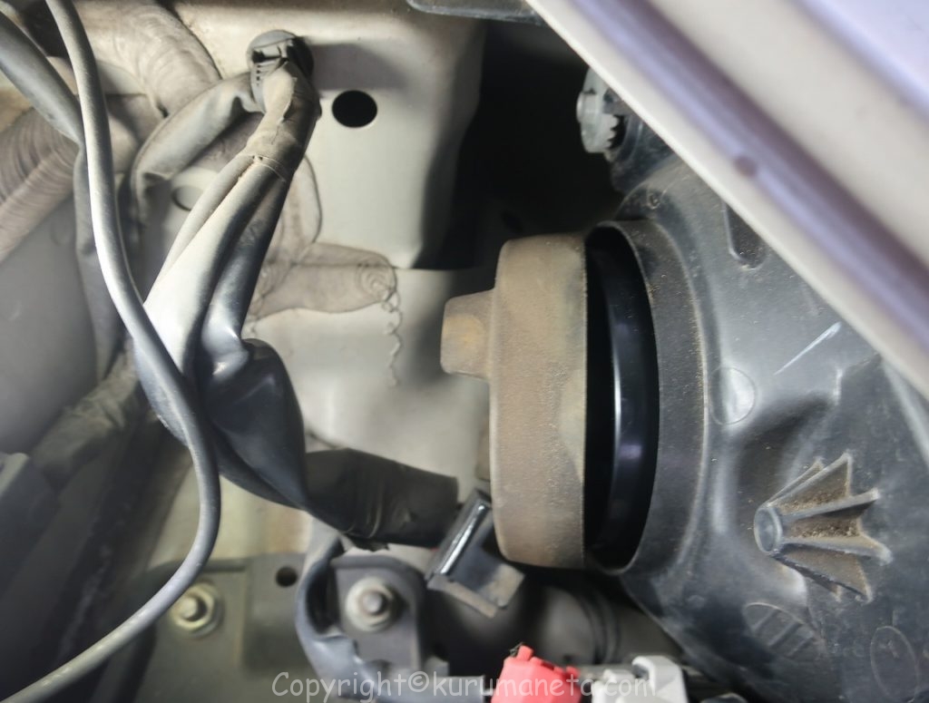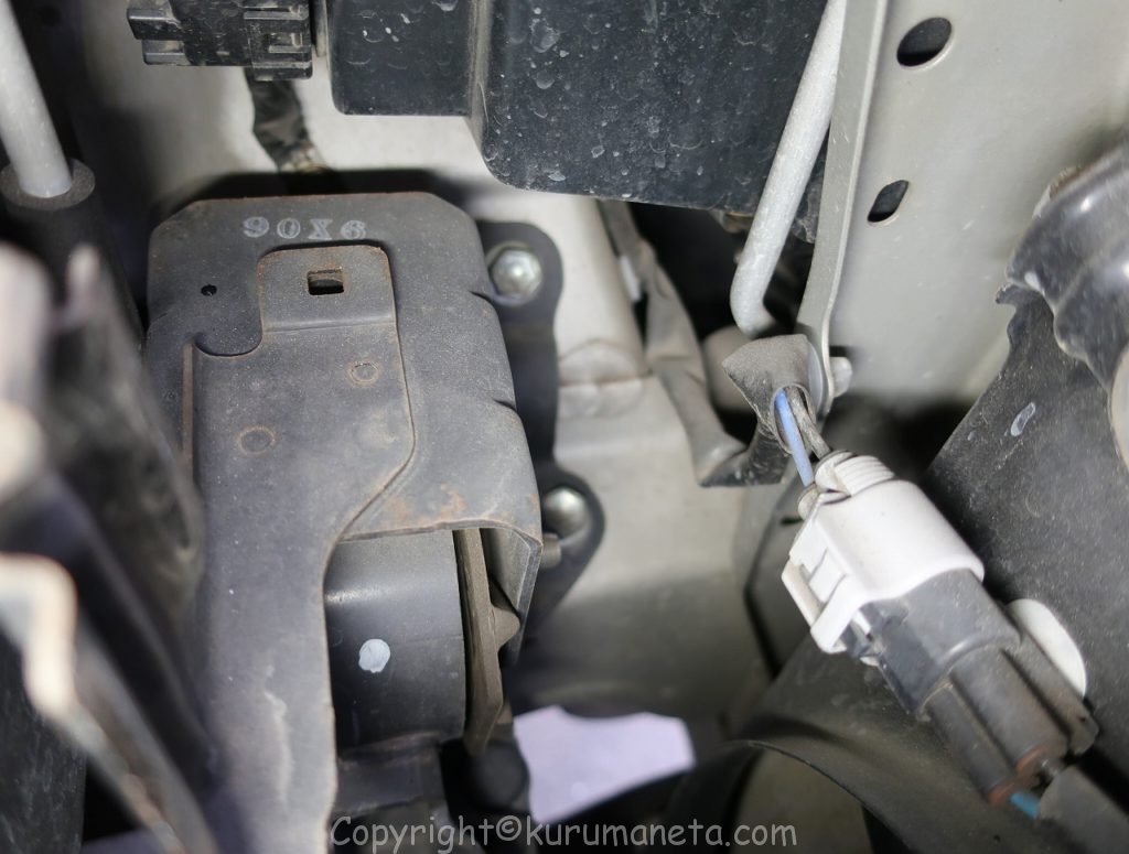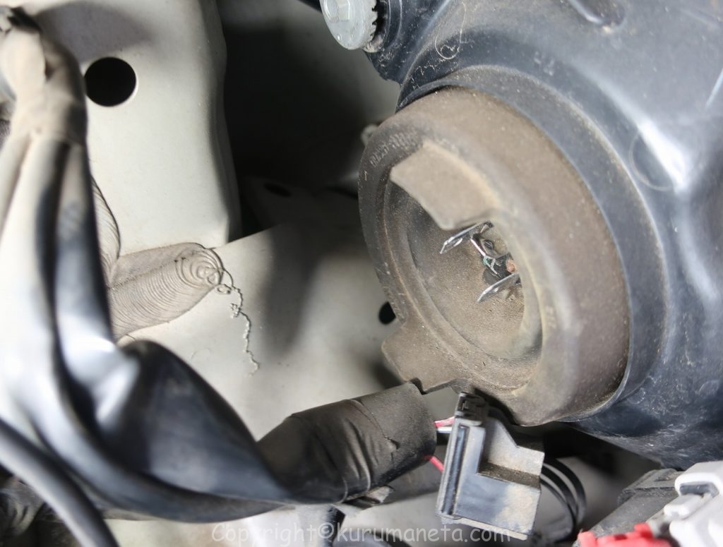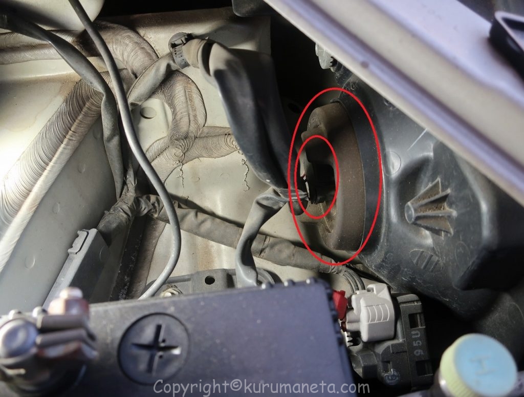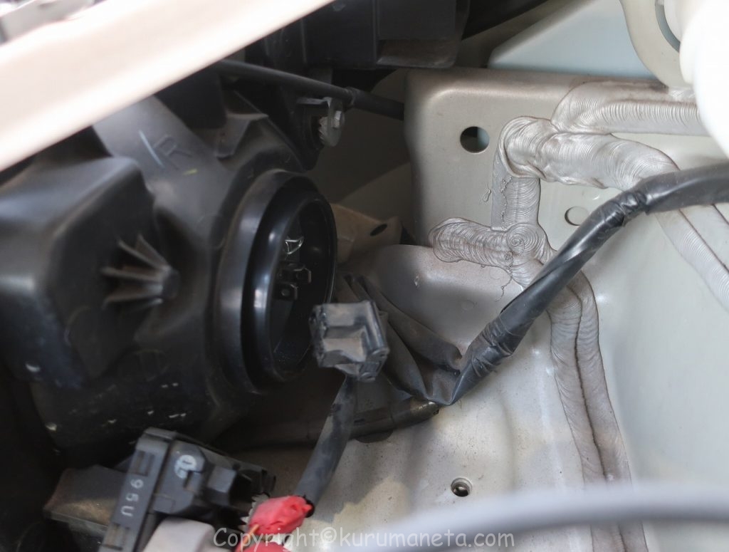 ボンネットを開けてヘッドライトの裏側をのぞき込むとヘッドライト用カプラーと黒いカバーがあるのでこれを外します。