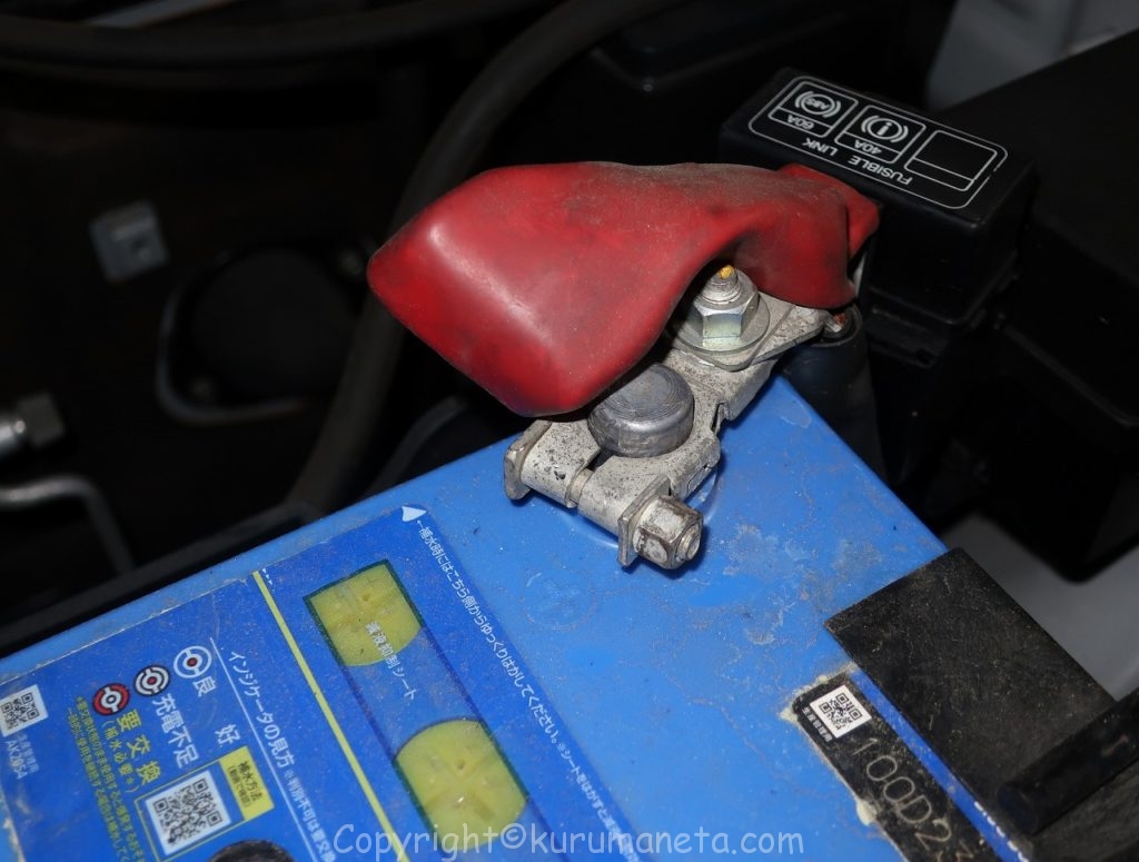 マイナス端子を外してからプラス端子を外すようにします。
