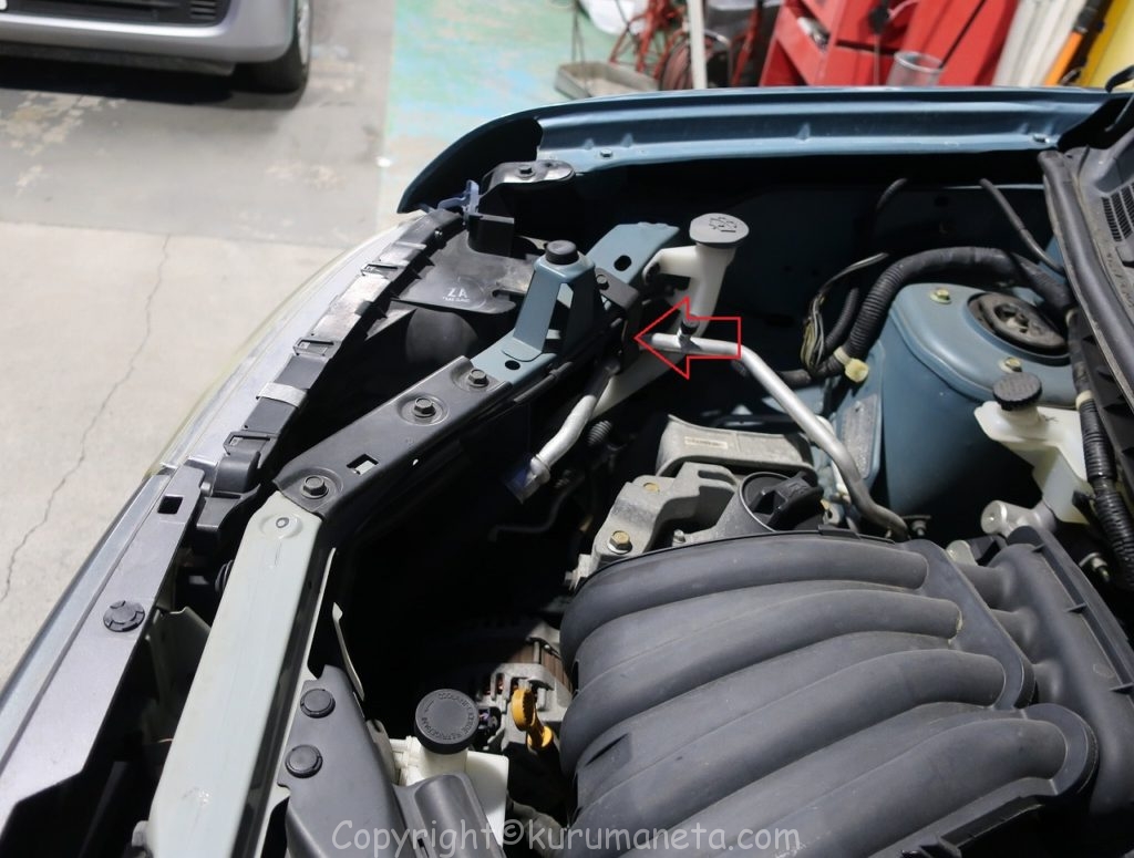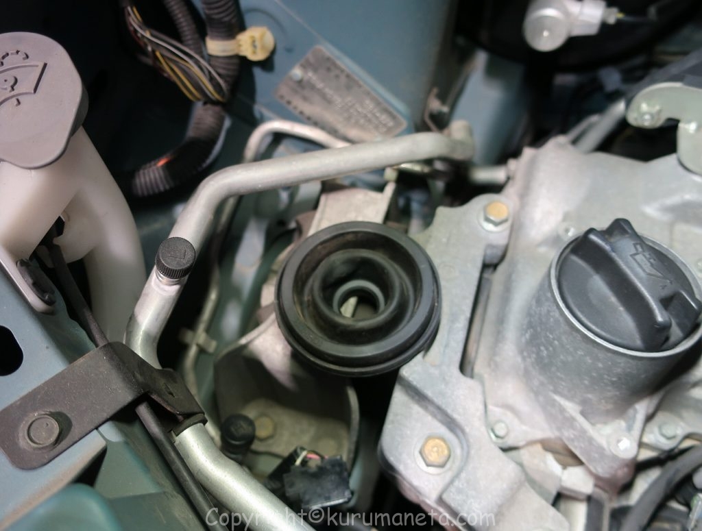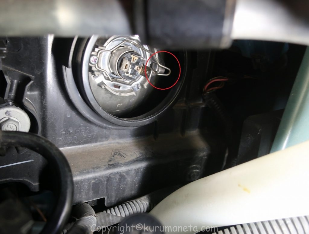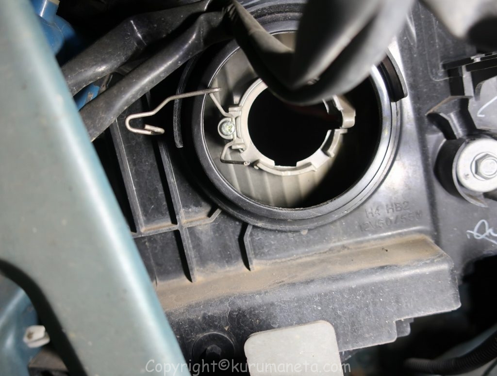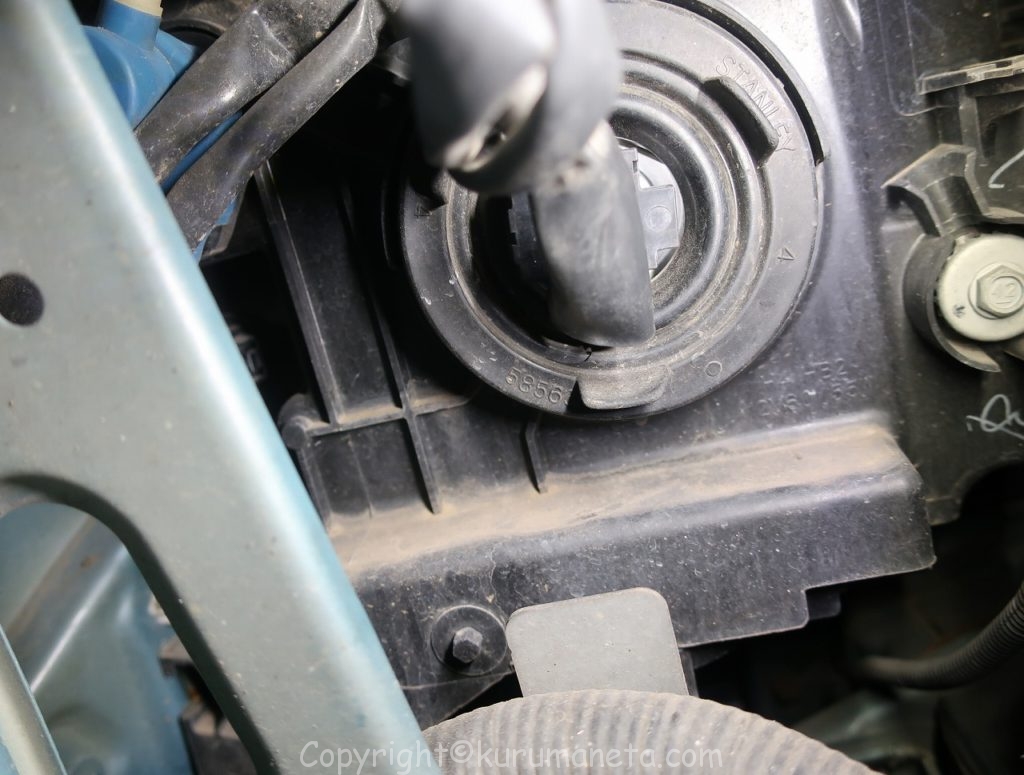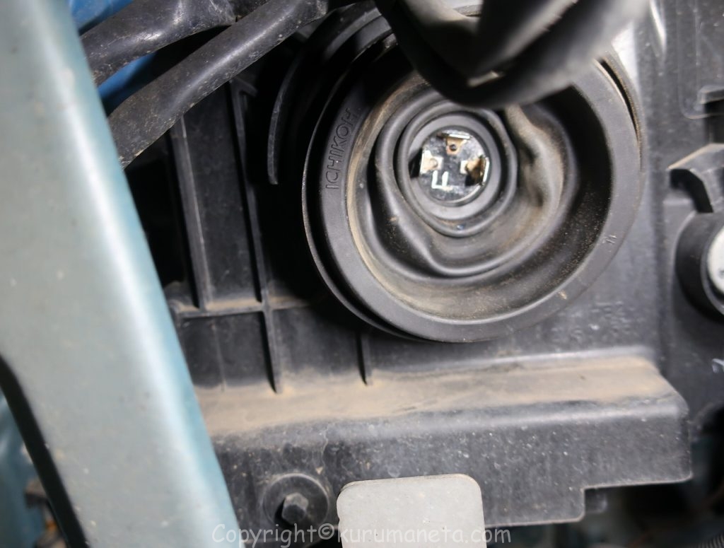 ボンネットを開けて、エンジンルーム内のヘッドライト裏側を見ると電源カプラーと黒いゴムカバーがありますので外します。