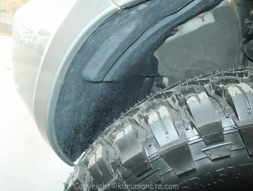 ハンドルを左に切ってタイヤハウスにスペースを作ります。
