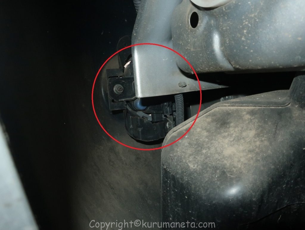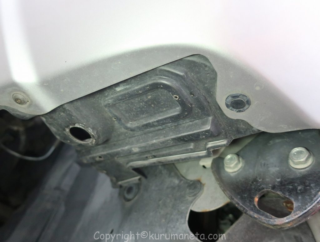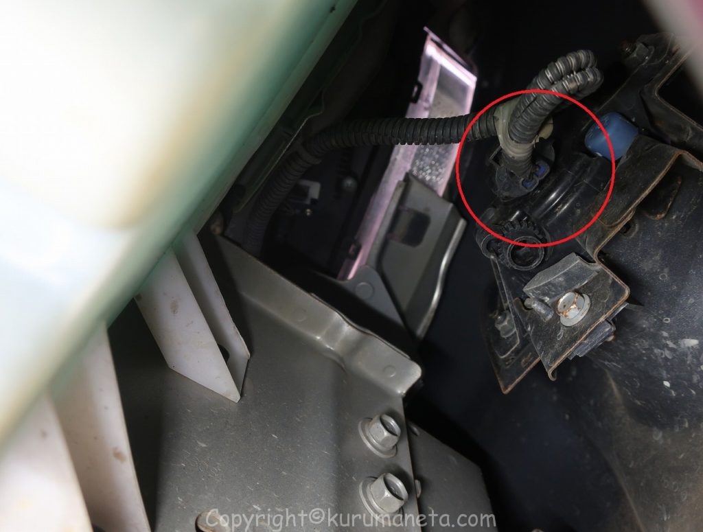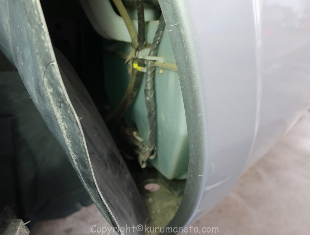 右側はウォッシャータンクが邪魔なので下から作業します。
