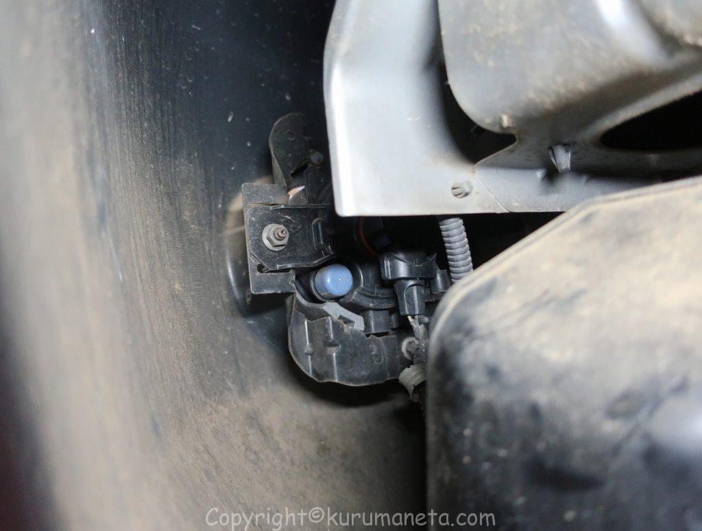 すると手を伸ばせば届く範囲にフォグランプがありますので、反対側同様に、反時計回りに回してバルブごと外します。