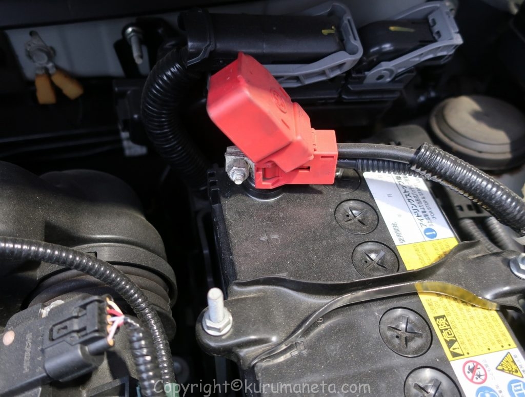 続いて赤いカバーを開けてプラス端子を外します