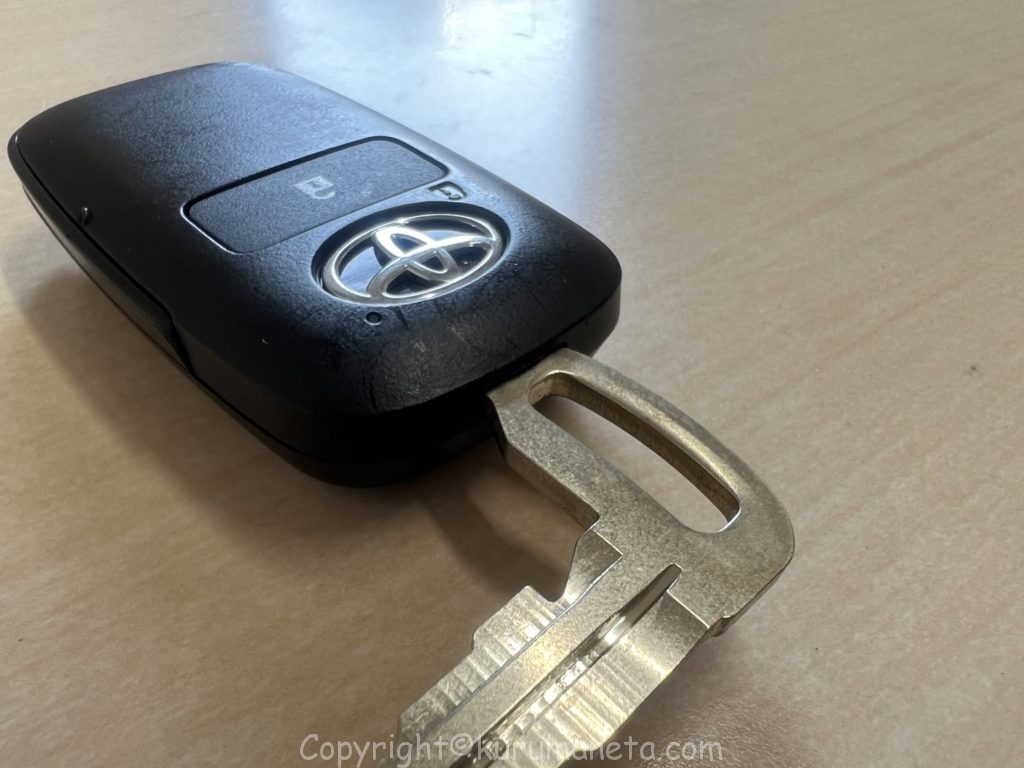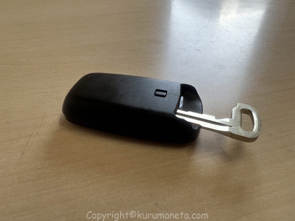 取り出したメカニカルキーの取っ手部分先端を、スマートキー先端のくぼみに入れて、軽くひねってテコの原理を利用してスマートキーを二つに割ります。