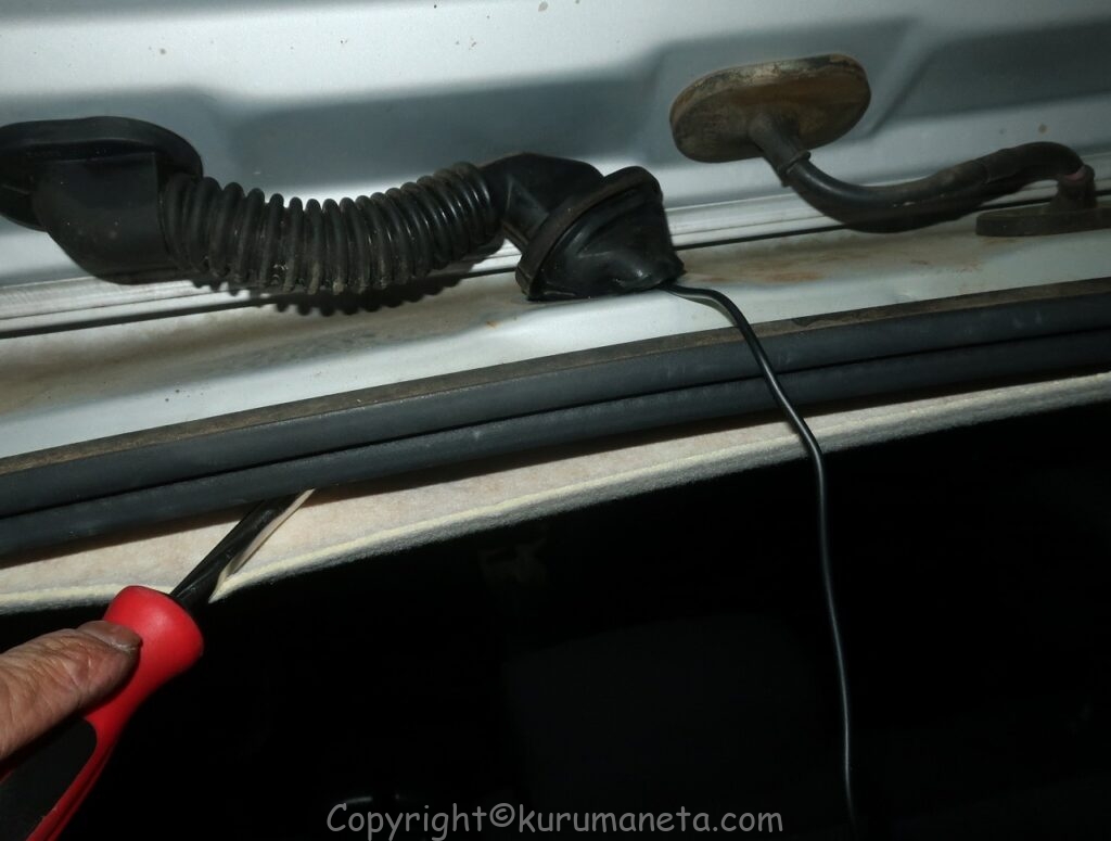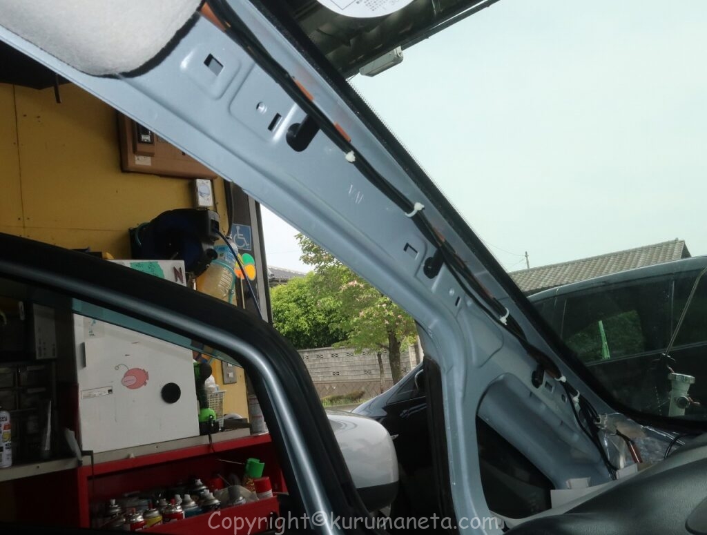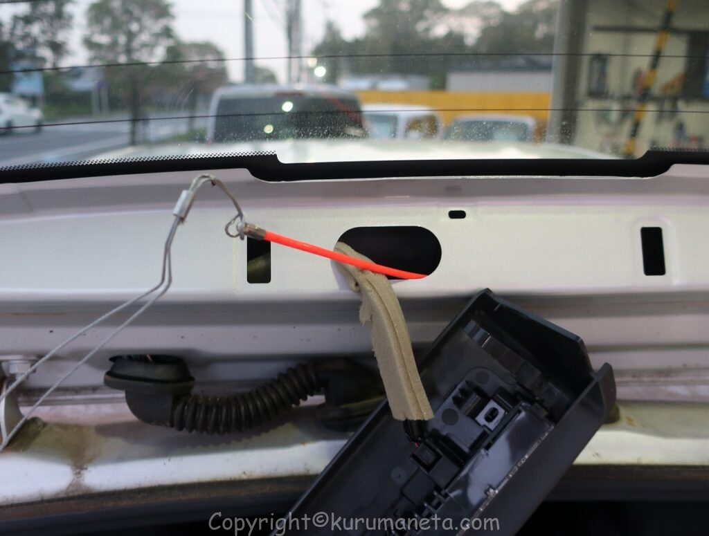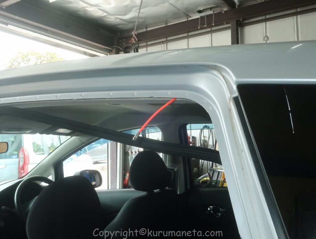 線通しを使ってルーフトリム内で隠れるようにフロントピラーまで通していきます
