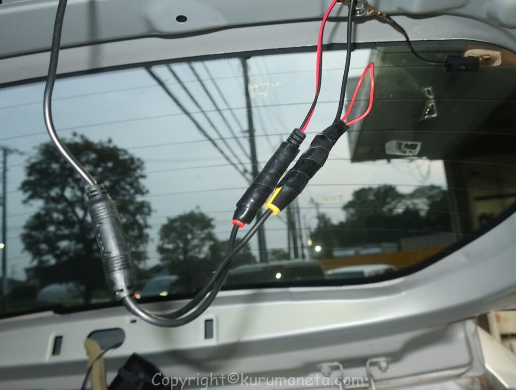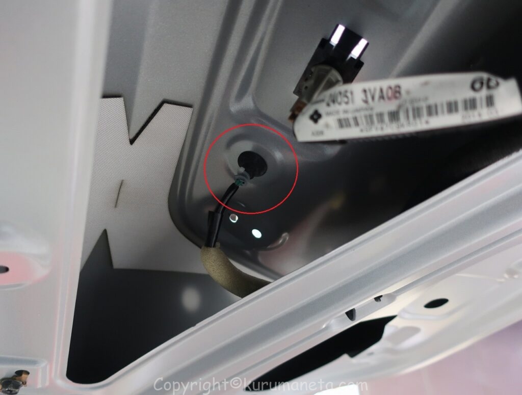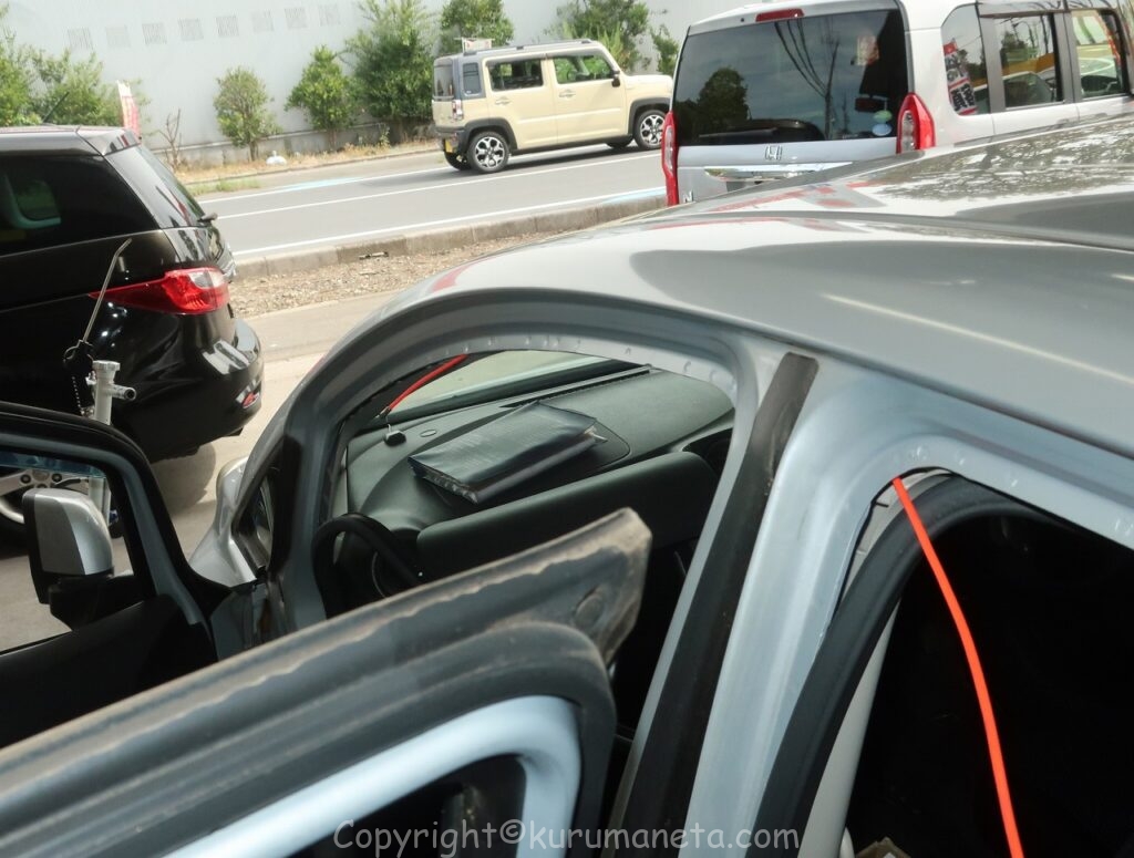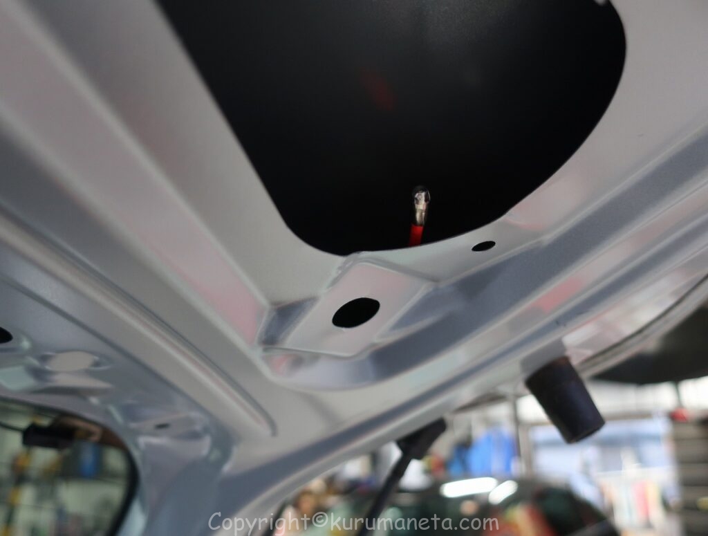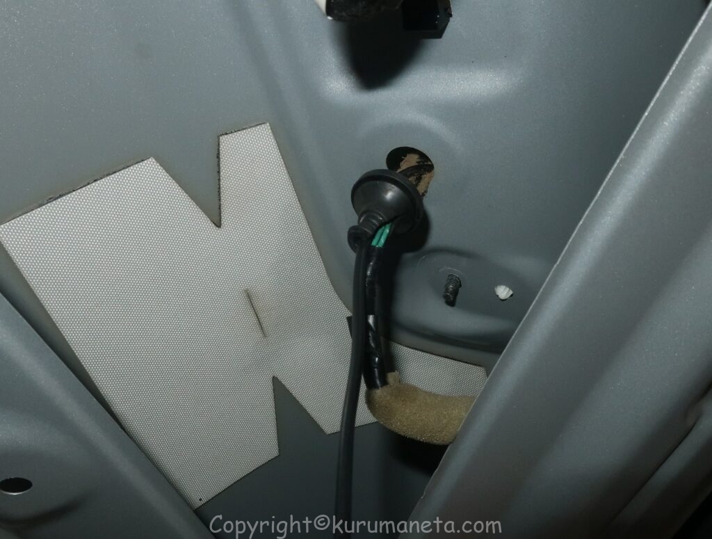 線通しを使ってルーフトリム内で隠れるようにフロントピラーまで通していきます