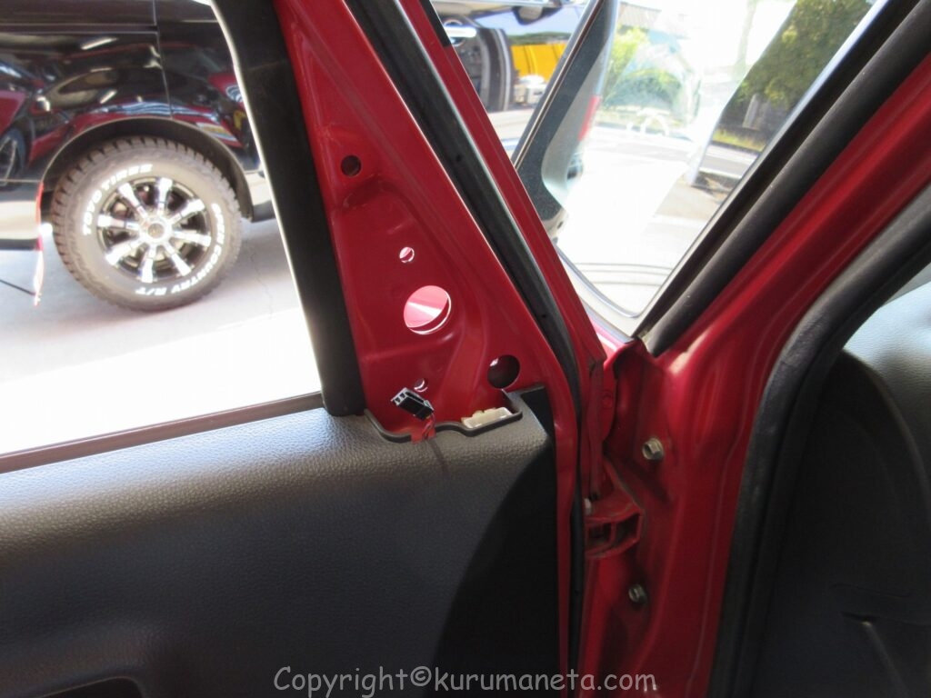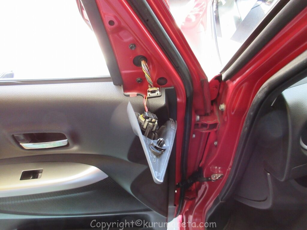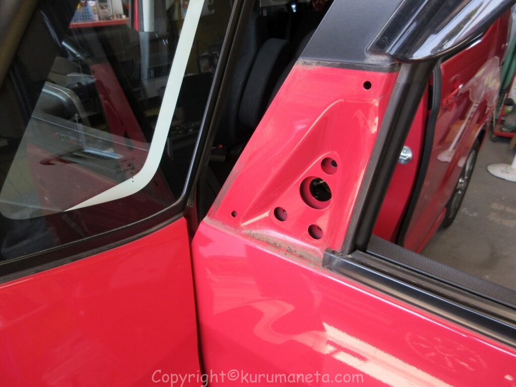 ドアを開けて、ドアミラーの土台の裏側にある三角カバーを取り外します。