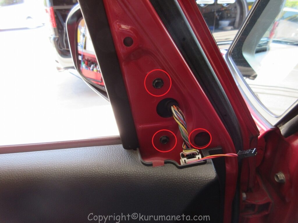 また、ボルトをすべて外すとドアミラー脱落の恐れがあるので、ドアミラー本体を支えながら作業します。