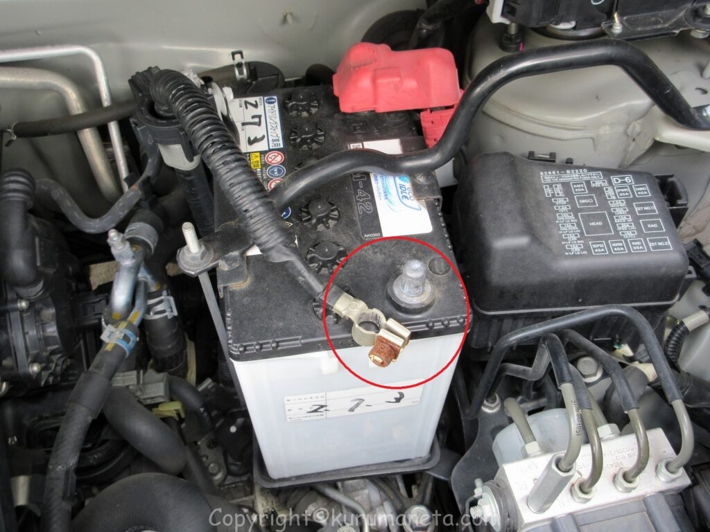 マイナス端子を外してからプラス端子を外すようにします。