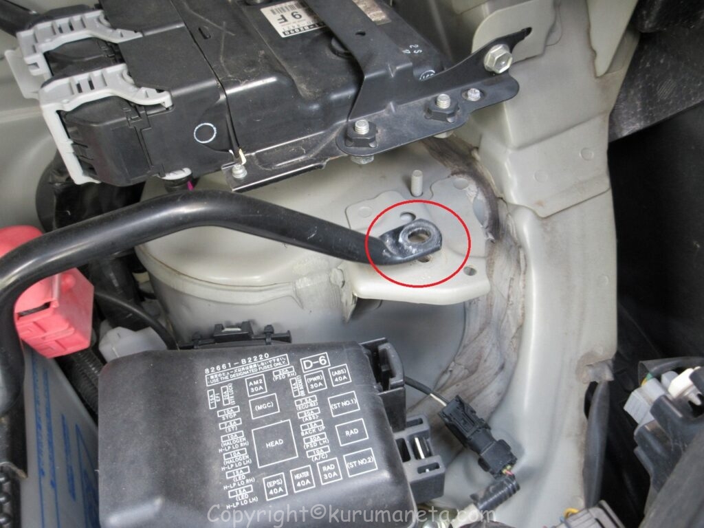 つづいてバッテリー固定ステーの端についているボルトを外して、ステーを取り外します。
